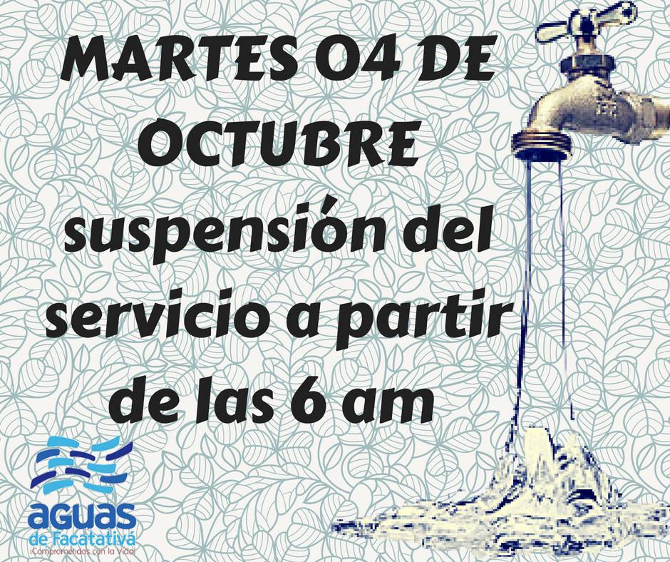 Mañana 4 de octubre se realizará suspensión del servicio a partir de las 6:00 a.m en toda la ciudad de Facatativá , según el Gerente de la Empresa Aguas de Facatativá Orlando Castro el servicio podría ser restablecido en su totalidad a las 4:00 pm dependiendo en las condiciones en que se desarrollen los mantenimientos. se van a realizar los siguientes mantenimientos: