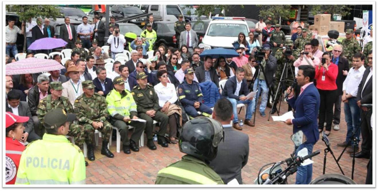 La Policía de Cundinamarca, liderada por el Coronel José Miguel Correa, recibió 19 patrullas y 42 motocicletas; el Ejército Nacional, representado por los generales Raúl Antonio Rodríguez, Comandante de la Quinta División y Gerardo Melo, Comandante de la Brigada No. 13, recibieron 13 motocicletas, kit de carreteras y material de intendencia; el CTI de la Fiscalía, seccional Cundinamarca, recibió dos Necro móviles y cinco vehículos tipo camioneta.