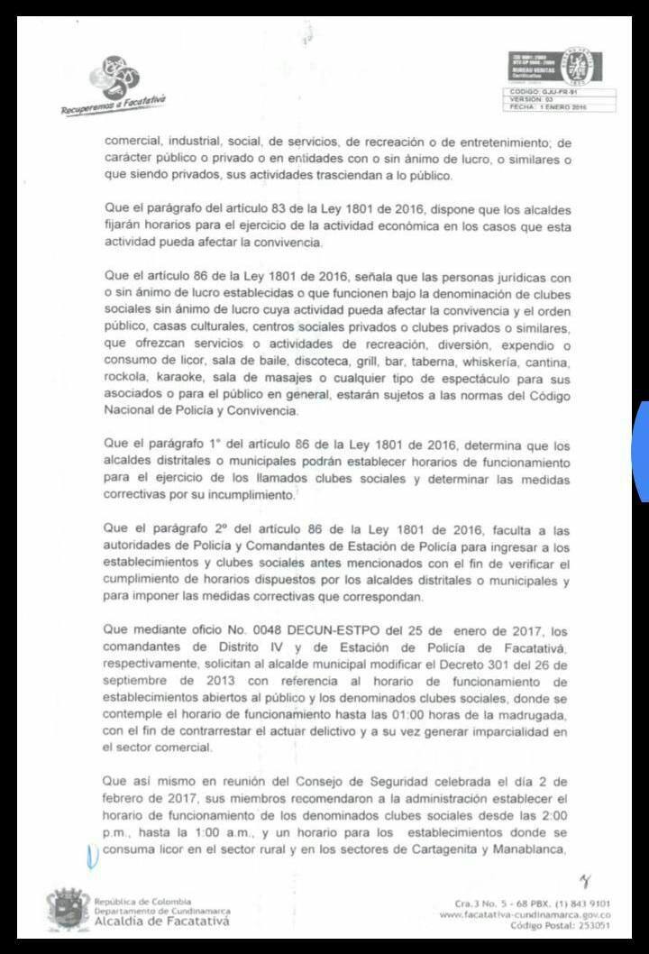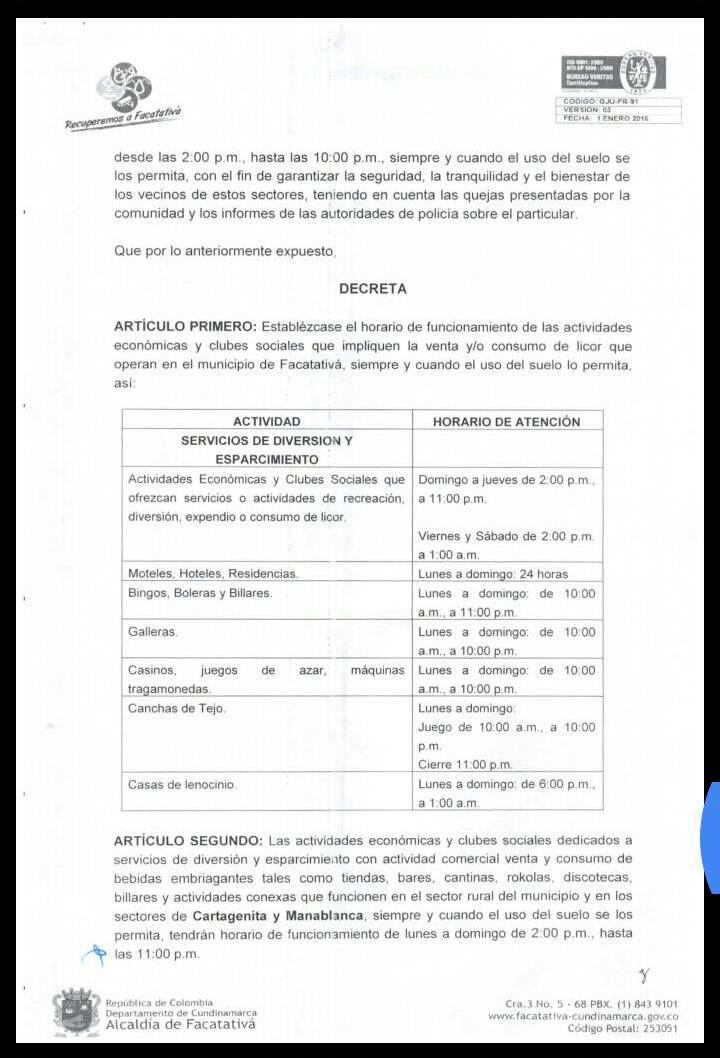 El Secretario de Gobierno de Facatativá Diego Zuleta anunció que el nuevo horario de cierre para los establecimientos nocturnos en Facatativá es hasta 1:00 am para el casco urbano y hasta las 10 pm para el sector rural.