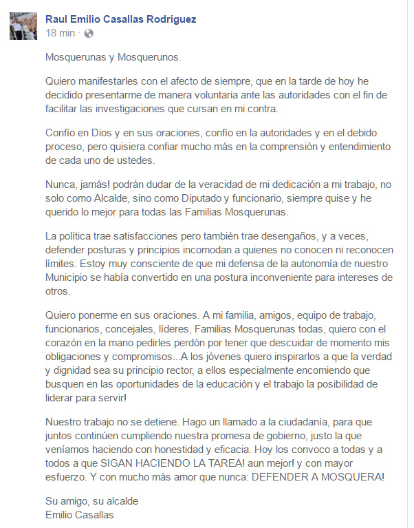 Declaraciones del Alcalde de Mosquera Emilio Casallas a través de su cuenta en Facebook sobre su entrega voltaria a las autoridades.