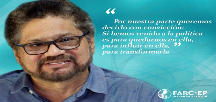Aunque el camino que transitamos es tortuoso y lleno de obstáculos, vamos hacia adelante, con la firme convicción de que estamos iniciando una nueva página en la historia de nuestro país. Presidente, no le fallemos a Colombia. Por nuestra parte queremos decirlo con convicción: Si hemos venido a la política es para quedarnos, para influir en ella, para transformala. Vamos de las armas a las palabras.
