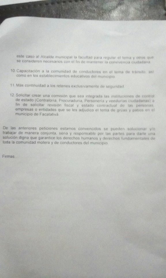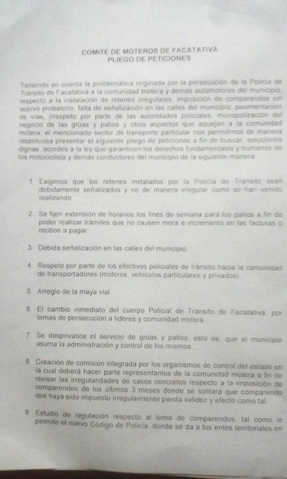 Puntos que se hablaran en la mesa de dialogo, por parte de los motociclistas