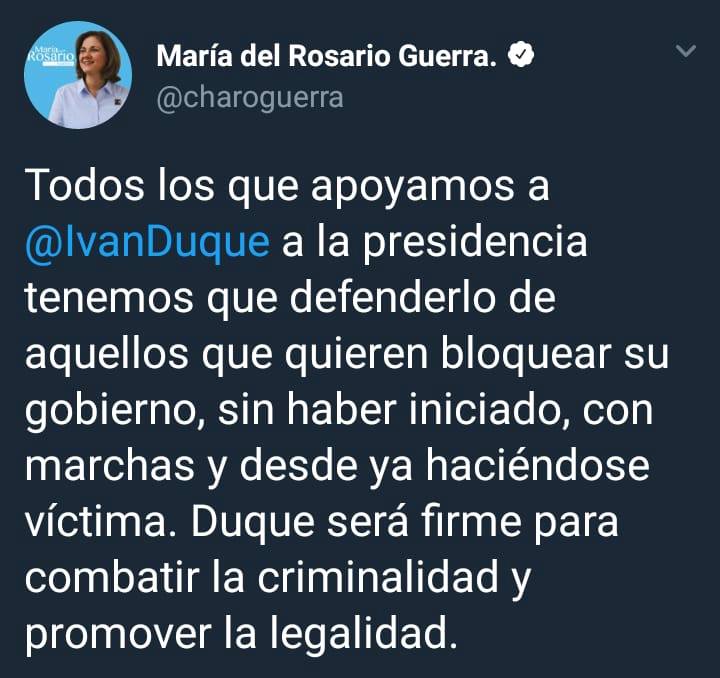 A este mensaje retwiteado por el senador Uribe, se sumó el de la senadora electa del Centro Democrático María del Rosario Guerra, quien cuestionó que la oposición del nuevo presidente Iván Duque, “se haga la víctima” con marchas: