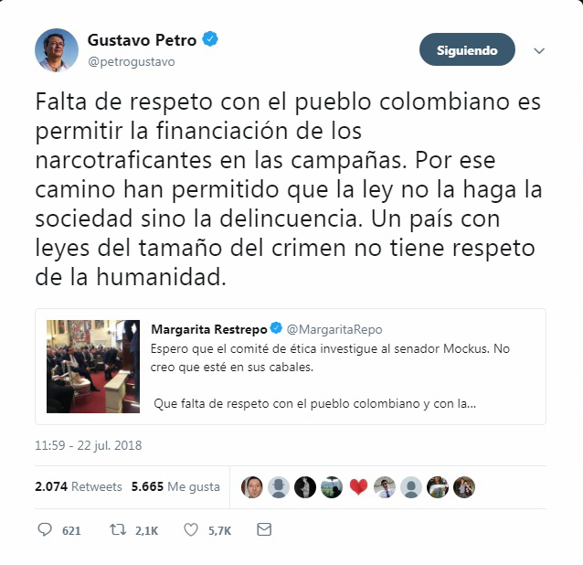 Lo que resultó más llamativo e irónico, es que en su queja hecha a través de su cuenta oficial en Twitter, destacó el actuar de Mockus como algo en contra de la democracia colombiana.