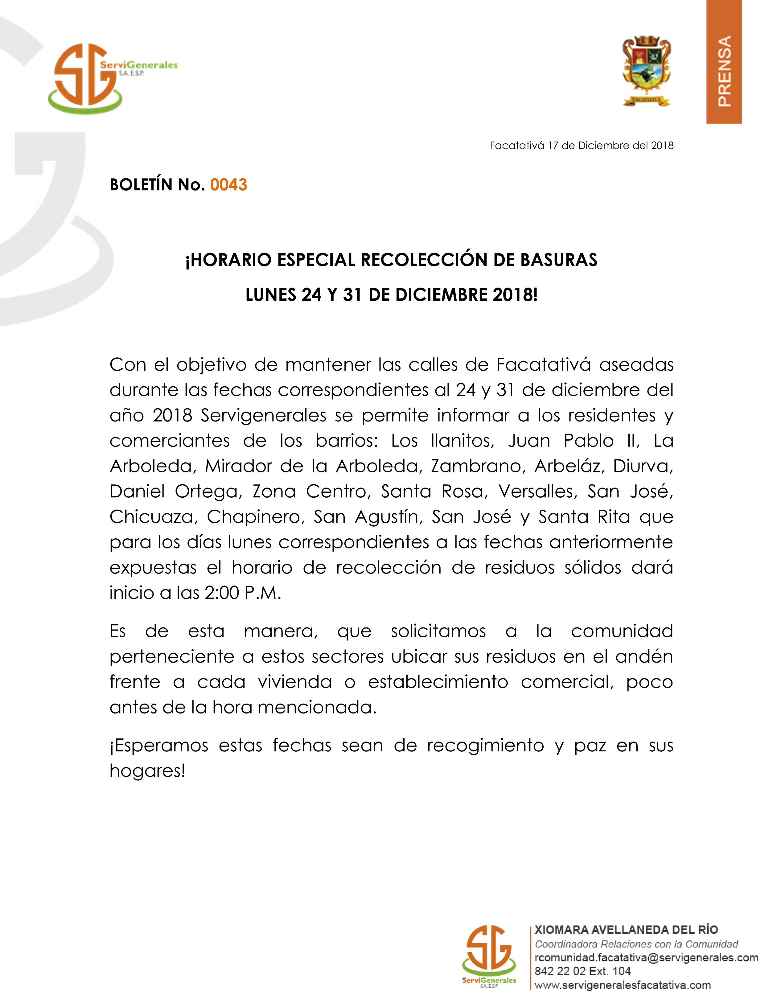 Facatativá, horario especial de recolección de basuras lunes 24 y 31 de diciembre por mutantes tv · Publicada 18 diciembre, 2018 · Actualizado 18 diciembre, 2018 Share Post Whatsapp COMUNICADO OFICIAL SERVIGENERALES Share Post Whatsapp