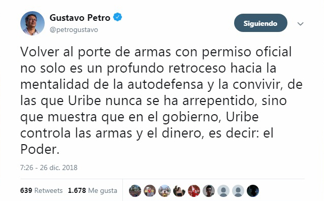“Volver al porte de armas con permiso oficial no solo es un profundo retroceso hacia la mentalidad de la autodefensa y la convivir, de las que Uribe nunca se ha arrepentido, sino que muestra que en el gobierno, Uribe controla las armas y el dinero, es decir: el Poder”, comentó.