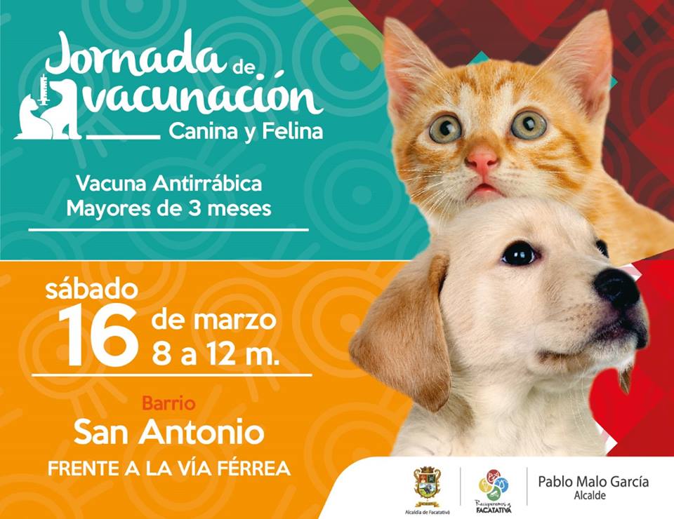 #MascotasSanas. El próximo sábado 16 de marzo la Alcaldía de Facatativá , continúa con las jornadas de vacunación antirrábica de caninos y felinos mayores de 3 meses. Esta vez la jornada se realizara en el barrio San Antonio de 8 de la mañana a 12 del medio día.