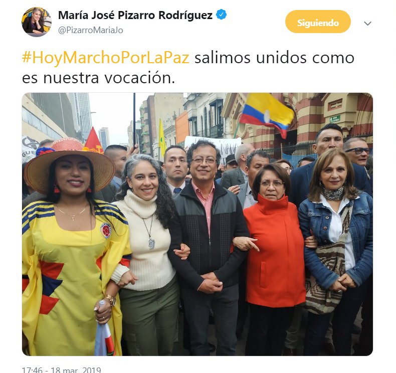 Colombia Humana, Alianza Verde, Farc, Decentes, UP, Colombia Renaciente, entre otros, estuvieron unidos por una sola causa y lograron una participación notablemente masiva, a pesar que incluso la vicepresidenta hizo un pronunciamiento en contra de la marcha, diciendo que con esta se pretende “poner contra la pared al Gobierno de Duque”.