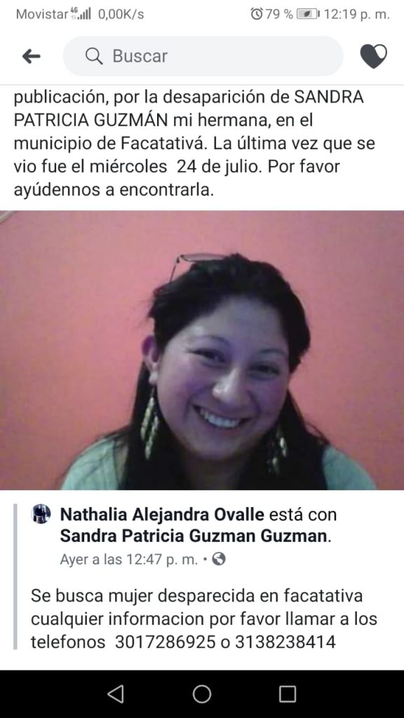 Ella es SANDRA PATRICIA GUZMÁN GUZMÁN de 38 AÑOS, reside en el barrio Santa Rita, desde el pasado 24 de julio sus familiares no tienen noticias de su paradero, fue vista por última vez vestida de chaqueta blanca y jeans, por los lados de la plaza de mercado.