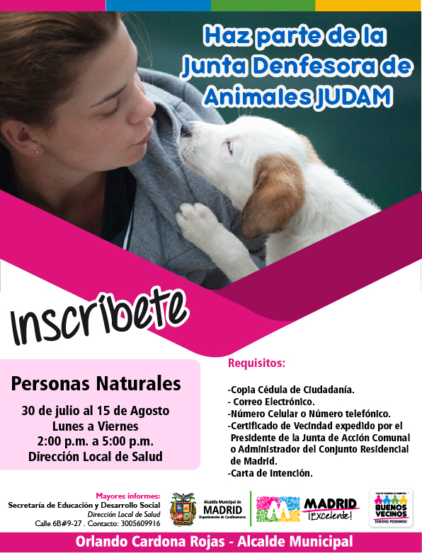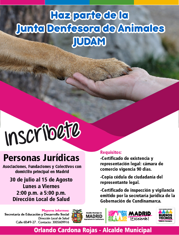 La Secretaría de Educación y Desarrollo Social de la mano de la Dirección Local de Salud dando cumplimiento a la ley 5° de 1972 en lo que concierne con la conformación de la JUDAM (Junta Defensora de Animales de Madrid) es por esto que se hace necesaria la presentación de la convocatoria para la conformación y participación de la comunidad, la participación de los temas de protección, gestión, control y la definición de políticas públicas de protección animal.