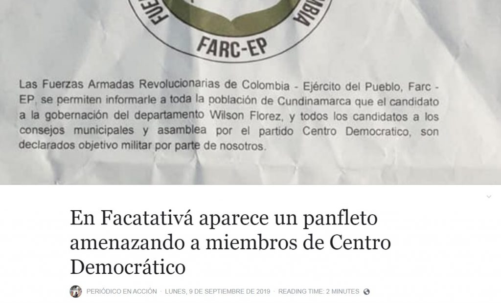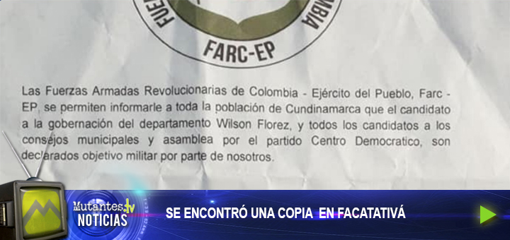 Un nuevo panfleto amenazante empezó a circular en las redes sociales, esta vez la alarma es el departamento de Cundinamarca, copia encontrada en el municipio de Facatativá, en esta ocasión el candidato a la gobernación de Cundinamarca Wilson Flórez y los candidatos inscritos por el partido Centro Democrático son declarados como «objetivo militar» la misiva esta en papel con un logo símbolo de las FUERZAS REVOLUCIONARIAS DE COLOMBIA – FARC -EP.