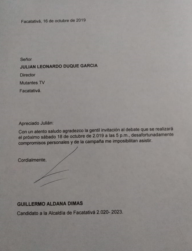 Facatativá, Guillermo Aldana NO asistirá al debate de Mutantes Tv