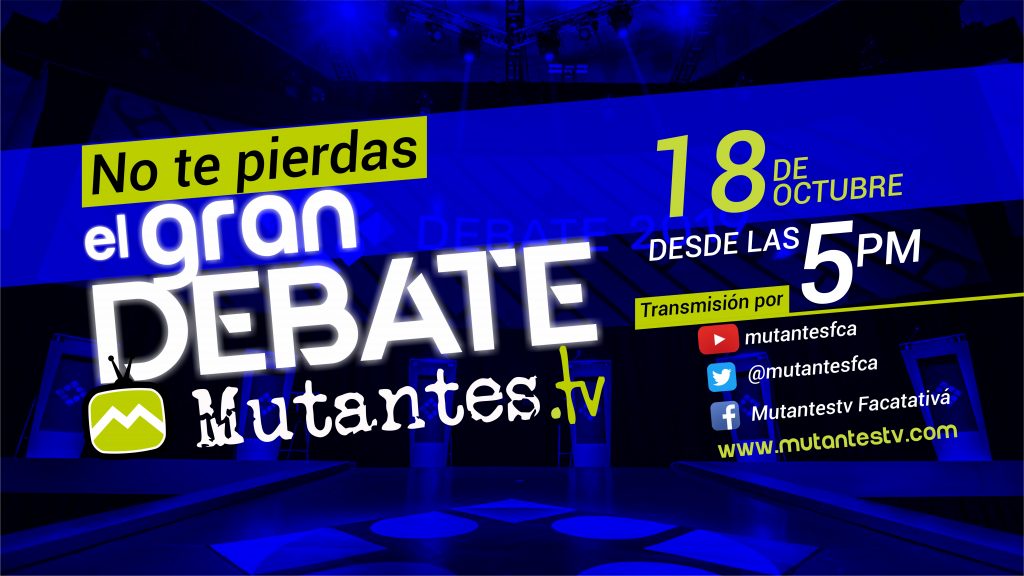 La candidata Roció García le afirmó a nuestro Director Julián Duque García que NO asistirá por compromisos de cierre de campaña el día viernes 18 de octubre y se le cruza con la hora del debate de Mutantes Tv, los otros candidatos nombrados por el momento no han presentado excusa de las razones por las cuales no pueden asistir al debate, sin embargo Pablo Bernal expresó que para ese día también tenía algunos compromisos pendientes relacionados con su campaña .
