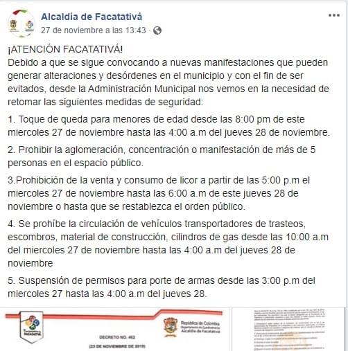 La Oficina de Prensa de Facatativá informó a nuestro medio de comunicación que está circulando un documento donde se decreta ley seca, toque de queda y otras medidas a raíz del paro nacional, según la información este comunicado es totalmente falso , es por esta razón que le piden a la comunidad consultar los medios locales o las páginas oficiales de la Alcaldía de Facatativá para no caer en desinformaciones que hacen algunas personas para generar molestias en la comunidad y generar miedo a los facatativeños . Afirma la Alcaldía de Facatativá en su página oficial . «El alcalde Pablo Emilio Malo García y la Administración Municipal desmiente el comunicado que está circulando por varias redes del municipio. En el se informan nuevas medidas de seguridad por nuevos desórdenes que se puedan presentar, lo que es totalmente falso, ya que no ha salido ningún nuevo decreto y las manifestaciones realizadas en el municipio se han llevado a cabo con tranquilidad».
