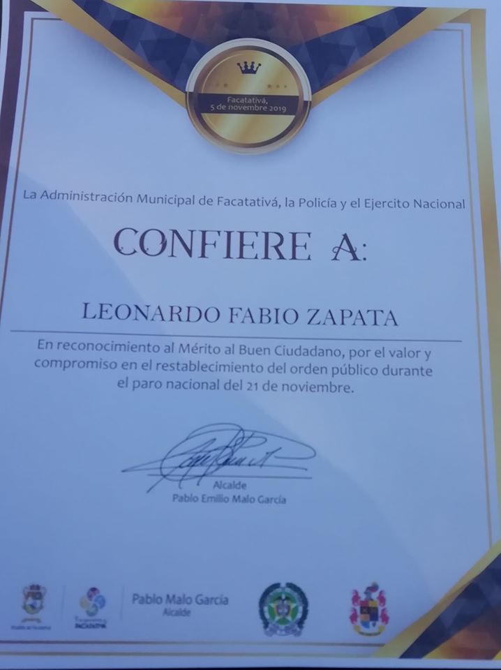 “En una ceremonia especial, sólo 2 medios de comunicación de Facatativá fueron reconocidos por su ardua labor el 21 de Noviembre, durante la Jornada de Manifestación y desmanes, La Policía Nacional, Ejército y Administración, Realizaron reconocimiento a nuestro Periodista, Leonardo Fabio Zapata Velásquez por su compromiso con la comunidad y brindar la Información oportuna y concisa de los acontecimientos de esa noche del Jueves”.