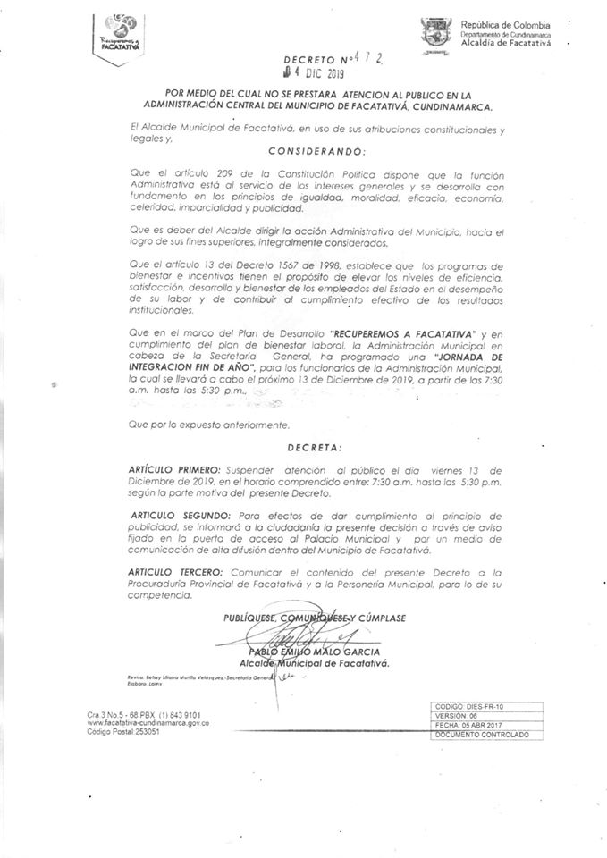 Facatativá, sin atención al público hoy 13 de diciembre por mutantes tv · 13 diciembre, 2019 Share Post Whatsapp ¡ATENCIÓN! El próximo viernes 13 de diciembre daremos cumplimiento al decreto 472, por medio del cual se estipula que no brindaremos atención al público ese día. Fuente de información Alcaldía de Facatativá Share Post Whatsapp