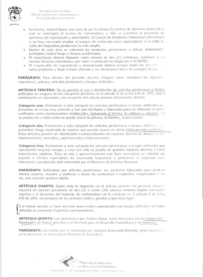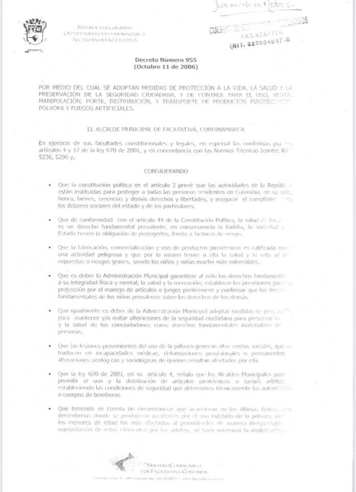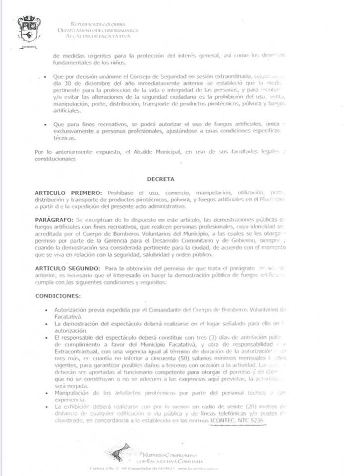 Para la Administración Municipal es importante la integridad de todos los facatativeños, por lo que compartimos con la comunidad el Decreto N. 955 de 2006 el cual establece la prohibición, el uso, comercio, manipulación, utilización, porte, distribución y transporte de productos pirotécnicos, pólvora y fuegos artificiales en el Municipio.