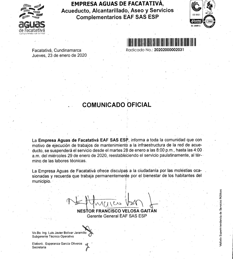 Facatativá, suspensión del servicio de agua para el próximo martes 28 de enero de 2020 por mutantes tv · Publicada 24 enero, 2020 · Actualizado 24 enero, 2020 Share Post Whatsapp Ejecución de Trabajos de Mantenimiento a la Infraestructura de la Red . Share Post Whatsapp