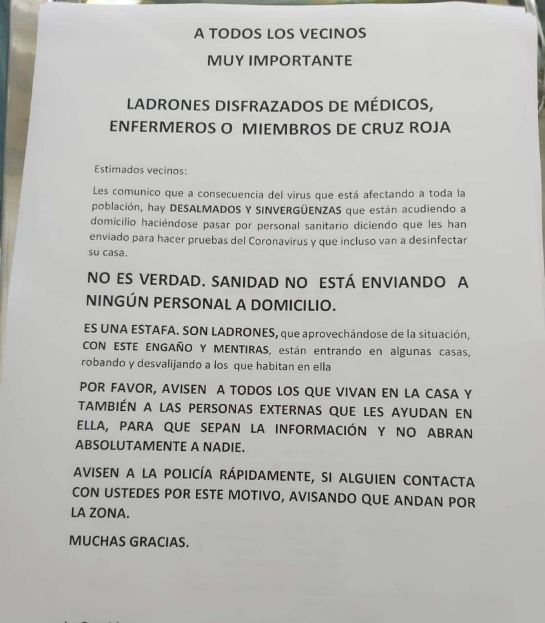 Uno de los primeros casos, que los vecinos de varios sectores de Bogotá han denunciado, es que falsos enfermeras o funcionarios de la Secretaría de Salud y de la Cruz Roja estarían pasando por las casas con el fin de -supuestamente- hablar de las actividades de prevención contra el coronavirus. De esta forma, estos sujetos buscan ganarse la confianza de los residentes y lograr hurtar varios objetos de estos hogares.