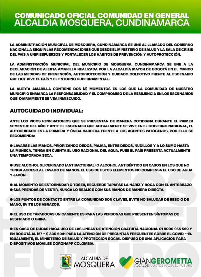 El Alcalde de Mosquera Gian Carlo Gerometta Burbano a través de las redes sociales, afirma que su municipio se suma a la alerta amarilla que implementó la Alcaldía Distrital de Bogotá y la Gobernación de Cundinamarca. Por el momento en el departamento de Cundinamarca no se ha registrado ningún caso .