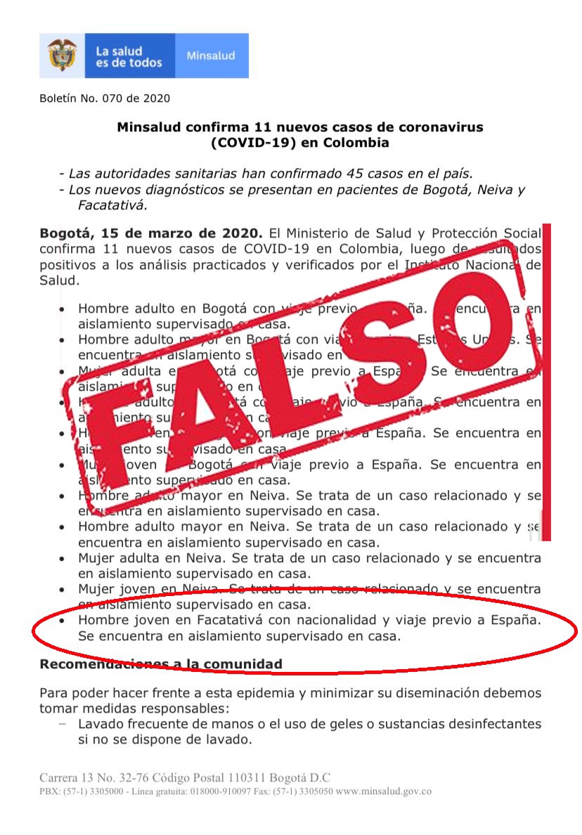 En horas de la noche el Gobierno Nacional emitió un comunicado afirmando que en Facatativá se generó un supuesto caso de coronavirus, medios de comunicación nacional como Noticias Caracol, Citytv y locales compartieron el comunicado porque la fuente de información fue el propio Ministerio de Salud de Colombia. En horas de la mañana el Periodista Carlos Barragán de Caracol Noticias aclaró la información , sin embargo varios medios nacionales siguen reportando que el caso se generó en Facatativá Cundinamarca .Lo más curioso del caso es que todavía el Ministerio de Salud en su página oficial tiene reportado el caso en Facatativá, cuando el caso se generó en el municipio de Subachoque Cundinamarca.El Alcalde de Facatativá Guillermo Aldana expresó en los micrófonos de Radio Unilatina, que no entendía porque la información no fue suministrada primero a la administración municipal y después ser emitía a nivel nacional, tampoco se entiende porque el Hospital San Rafael no informó del caso dos días antes , cuando el paciente de Subachoque informó sobre su estado el pasado 13 de marzo. Una vez se conoció que la información fue errada algunos ciudadanos a través de las redes sociales insultaron a varios medios locales y nacionales porque supuestamente difundieron información falsa, cuando el comunicado fue emitido por el propio Gobierno Nacional .