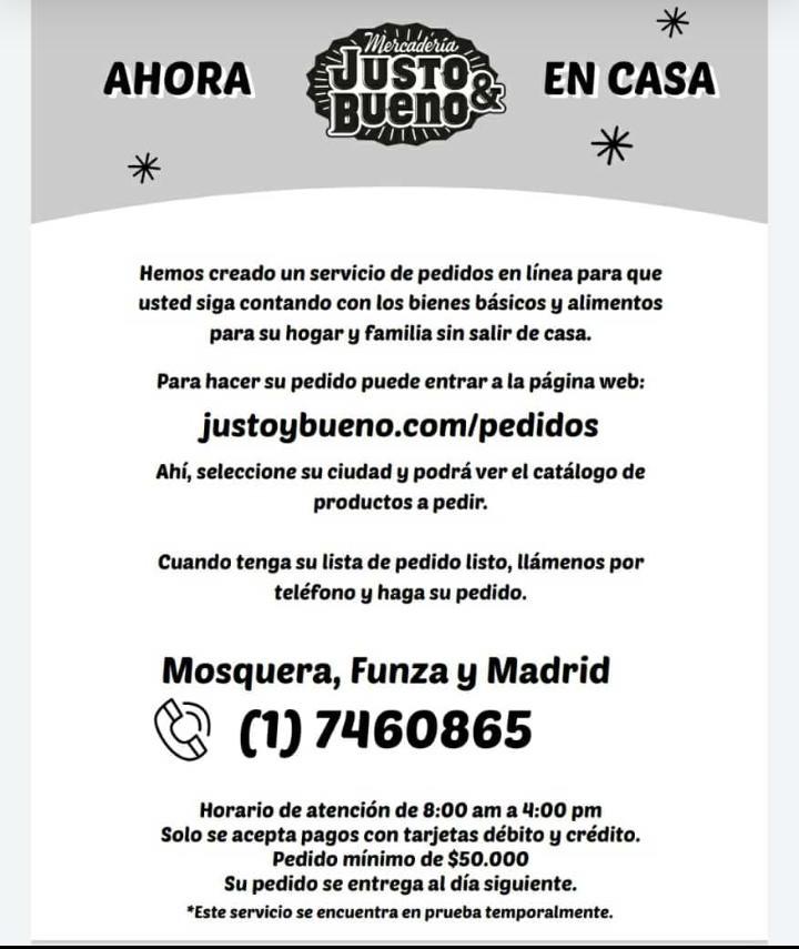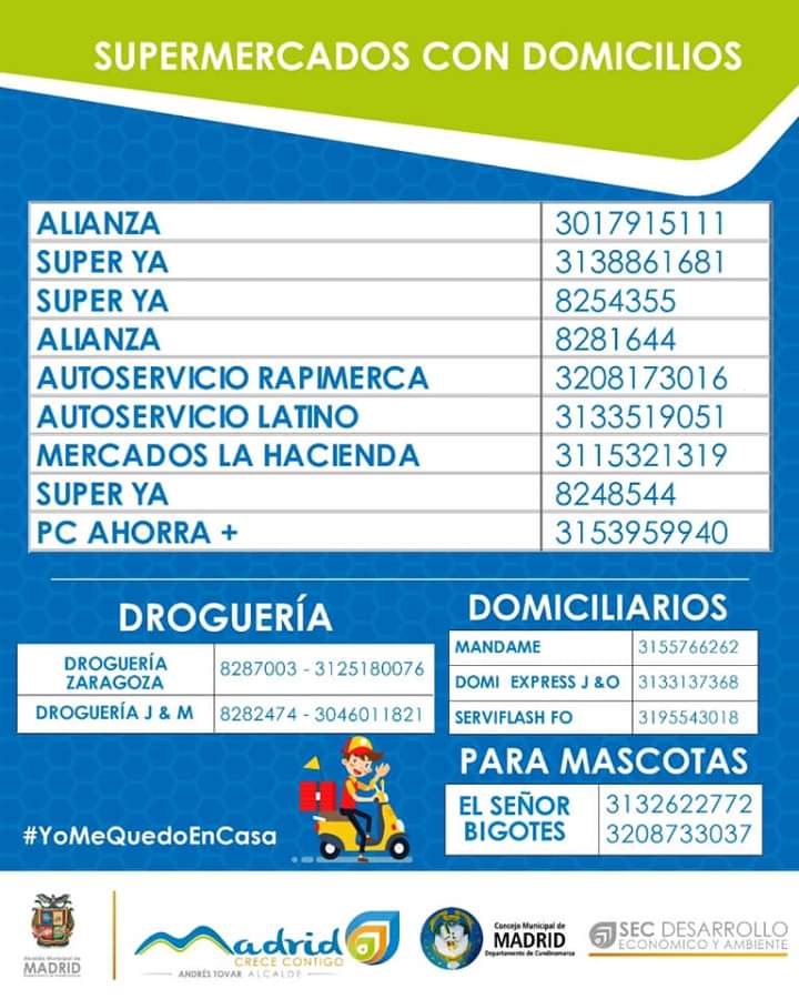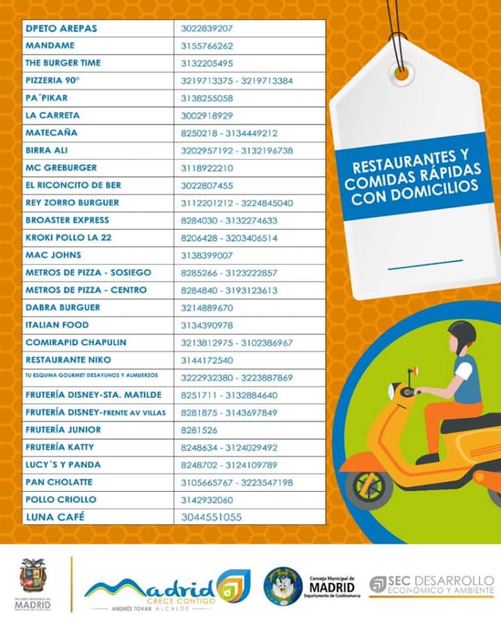 En Municipios como Madrid, Mosquera y Funza los diferentes restaurantes, supermercados y locales de comidas rápidas incrementaran su servicio de domicilios. En horas de la noche nuestro medio de comunicación Mutantes. Tv estará realizando una trasmisión de Facebook live en horas de la noche para que entre todos creemos una agenda de números telefónicos de establecimientos de comercio que presten este servicio.