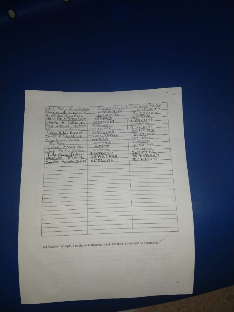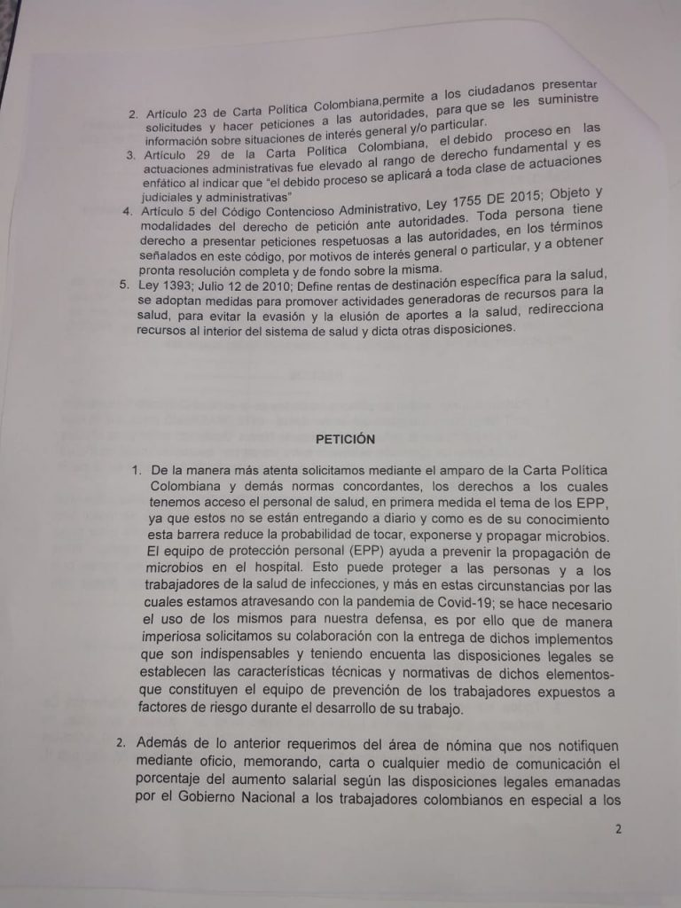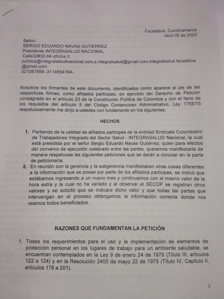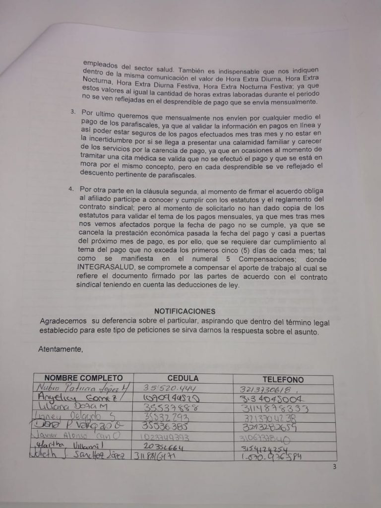 Mas 70 funcionarios del Hospital San Rafael de la central de urgencias entre enfermeras, auxiliares de enfermería y personal de farmacia radicaron este documento de peticiones a la gerencia del Hospital San Rafael , Secretaría de Salud , Alcaldía de Facatativá y Personería Municipal para que de alguna forma les puedan ayudar en garantizar sus derechos como funcionarios salud y el derecho a que se les respeto sus condiciones laborales , con pagos justos y dignos .