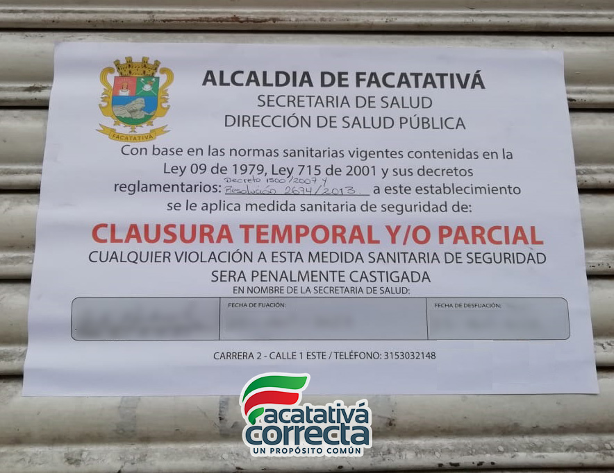 La Secretaría de Salud reportó que realizó el cierre de un local de expendio de carne por violación a la ley 9 de 1979, debido al incumplimiento de la normatividad sanitaria.