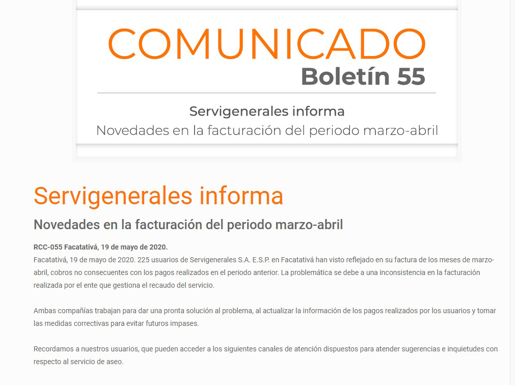 Facatativá, Servigenerales informa, novedades en la facturación del periodo marzo-abril por mutantes tv · 22 mayo, 2020 Share Post Whatsapp COMUNICADO DE PRENSA Share Post Whatsapp