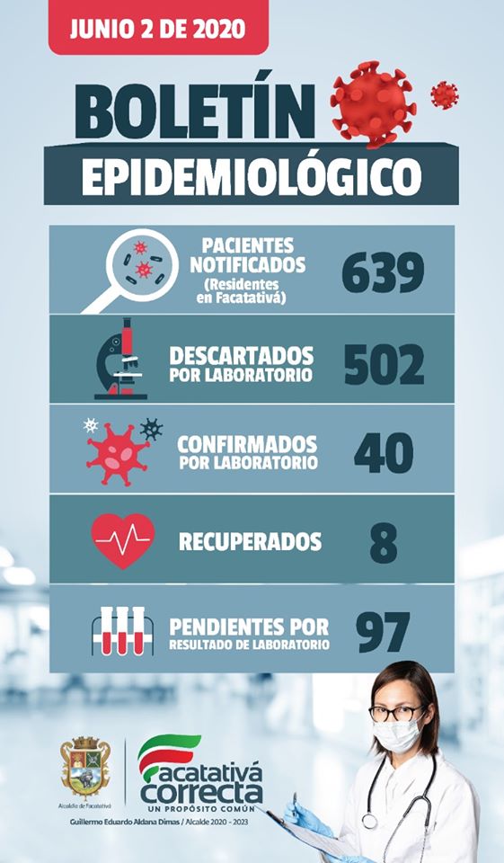 El Señor Alcalde Guillermo Aldana Dimas y la Secretaría de Salud reportan que a la fecha se han tomado muestras por sospecha de contagio con Coronavirus – COVID-19 a 639 personas, de las cuales 502 han sido descartadas y se tienen 97 pruebas pendientes por recibir el resultado del laboratorio. En Facatativá a la fecha se han reportado 40 casos positivos de Coronavirus – COVID-19, de los cuales 8 se han recuperado.