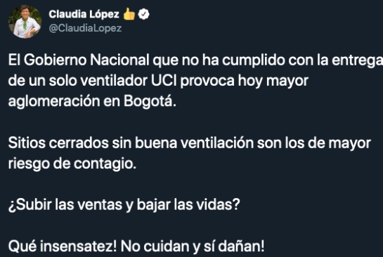 A través de su cuenta de twitter, la alcaldesa de Bogotá, Claudia López, aseguró que el Gobierno Nacional no solo no ha cumplido con la entrega de ventiladores para las UCI, sino que está poniendo en riesgo a la población con el día sin IVA, llevando a que las personas salgan a comprar en lugares sin ventilación y en medio de aglomeraciones.
