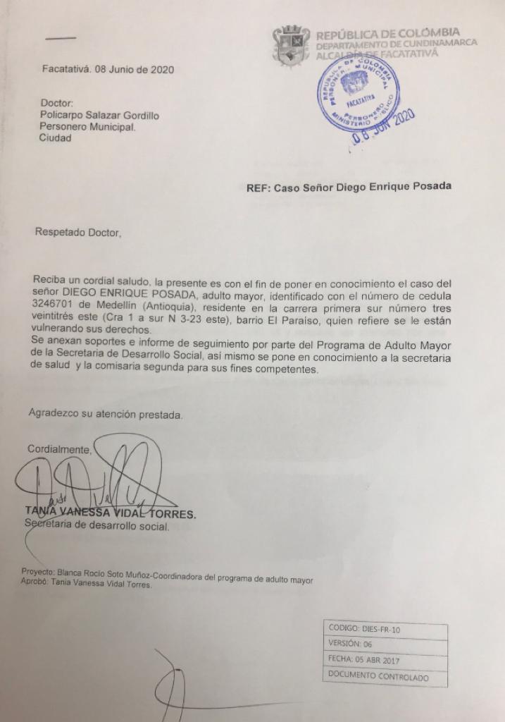 Funcionarios de la Secretaria de Desarrollo Social estuvieron en la vivienda del señor Posada que pertenece a la EPS Capital Salud, la Secretaria de Desarrollo Social afirmó a Mutantes Tv, que el adulto mayor expreso que necesitaba dinero para trasladarse a la ciudad de Bogotá porque los procesos de citas en Facatativá tomaban mucho tiempo y por esta razón no acepto la ayuda de los funcionarios “Julián nosotros no podemos obligar al señor a que lo atiendan en Facatativá”, por esta razón tomamos la decisión de enviar un oficio a la Personería Municipal , exponiendo los hechos, al señor también se entrego ayuda alimentaria, señalo la funcionaria.
