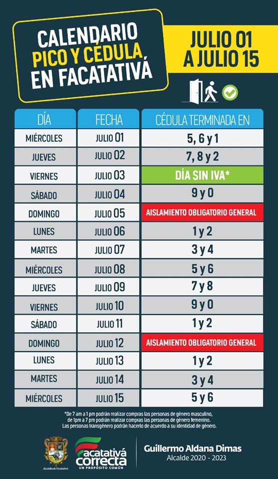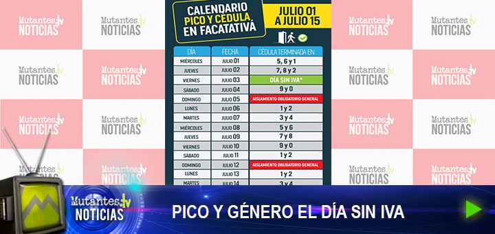 Tenga en cuenta que los domingos se mantiene la medida de aislamiento obligatorio general y que este viernes 3 de julio, en el marco del «Día sin IVA» se aplicará la norma de pico y género