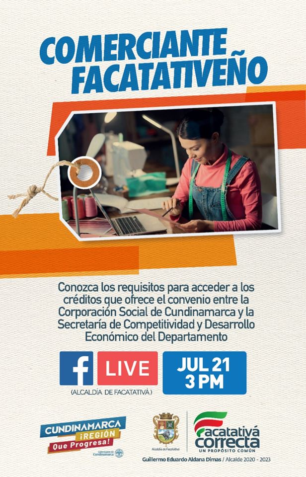El Señor Alcalde Guillermo Aldana Dimas y la Secretaría de Desarrollo Económico de Facatativá con el apoyo de la Secretaría de Competitividad y Desarrollo Económico de Cundinamarca y la Corporación Social de Cundinamarca invitan a emprendedores, microempresarios y comerciantes que requieran acceder a la línea de crédito que ofrece el gobierno departamental.