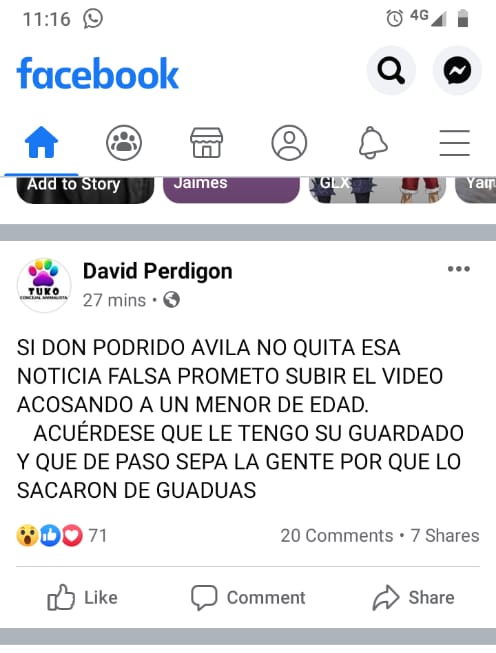 Según nuestras fuentes el Concejal lanzo estas serias acusaciones el pasado 16 de mayo del año 2020 cuando el medio de Comunicación digital Rodrigo Ávila afirmó que en los barrios Siete de Agosto y Villa Rosita existen algunas personas que presuntamente tenia covid-19 revelando las direcciones de las residencias de estas personas, por esta noticia este medio de comunicación tuvo que hacer la respectiva rectificación por exigencias de algunas familiares que no estuvieron de acuerdo con lo escrito por este medio que causo confusión en Facatativá, lo más grave del caso es que el Concejal perdigón afirmó que si el comunicador no retiraba esa noticia falsa publicaría un video donde el señor Ávila acosaba a un menor de edad.
