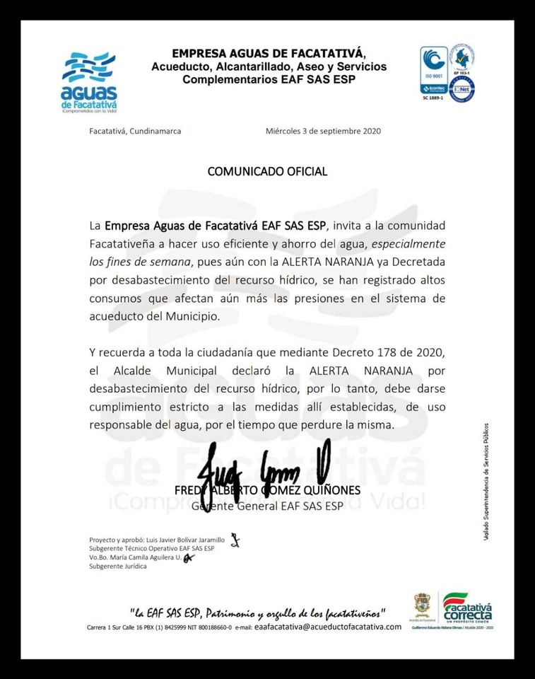 La Empresa Aguas de Facatativá alerta sobre el registro de altos consumos de agua, especialmente durante los fines de semana, a pesar de la alerta naranja decretada en días pasados.
