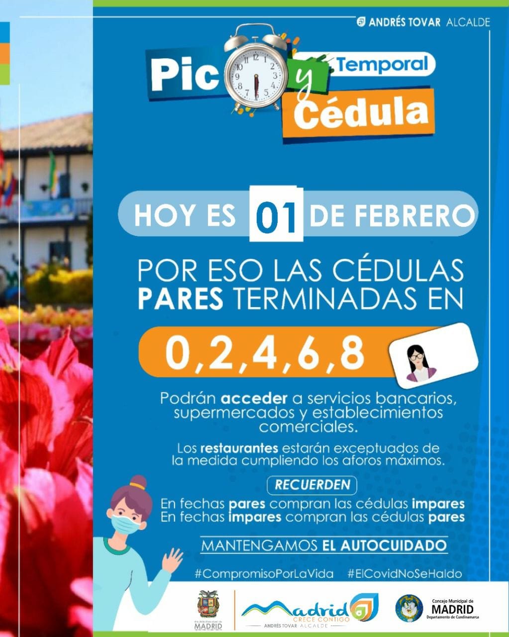La Alcaldía de Madrid realizó está publicación de pico y cédula el día de hoy primero de febrero aproximadamente a las 7:30 de la mañana. La fotografía muestra que números tienen pico y cédula el día de hoy pero aún no sabemos hasta cuando irán estas medidas sanitarias.