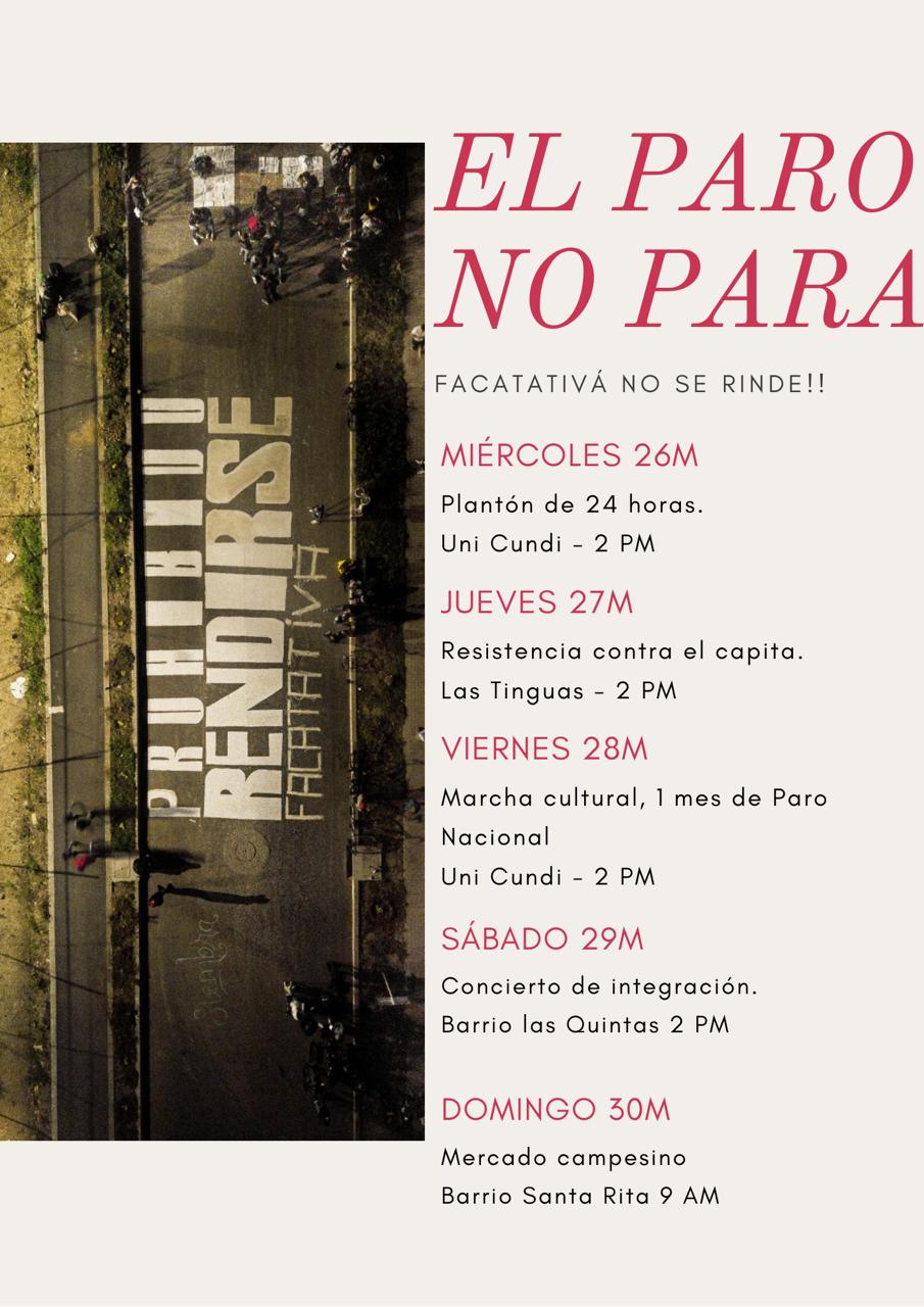 A través de redes sociales se está replicando esta información de la programación y actividades que se tienen programas para este fin de semana en Facatativá , aclaramos a la comunidad que se desconoce por el momento quienes están realizando este tipo de comunicados debido a que no están firmados por ninguna organización juvenil, sindical, partido político y grupos relacionados con miembros del Comité del Paro Nacional , según algunos promotores lo hacen por razones de seguridad, otras personas señalan que el paro es del pueblo y que no necesitan divulgar quienes están organizando estas actividades .