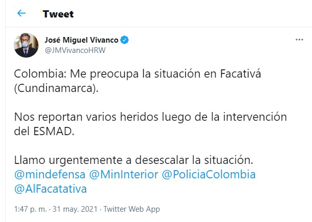 Desde su cuenta de twitter y a través de medios de comunicación nacional lanzo una alerta al gobierno nacional sobre la situación de orden público en Facatativá, desde Mutantes TV agradecemos Human Rights Watch por tener en cuenta las denuncias de los medios alternativos y comunidad de Facatativá .José Miguel Vivanco, es Director de la División de las Américas de Human Rights Watch