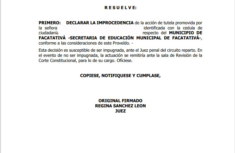 Ante el Juzgado Segundo Penal Municipal de Facatativá Cundinamarca fue presentada acción de tutela en contra de la SECRETARÍA DE EDUCACIÓN DE FACATATIVÁ, por una docente de la Institución Educativa municipal Nacional Emilio Cifuentes,