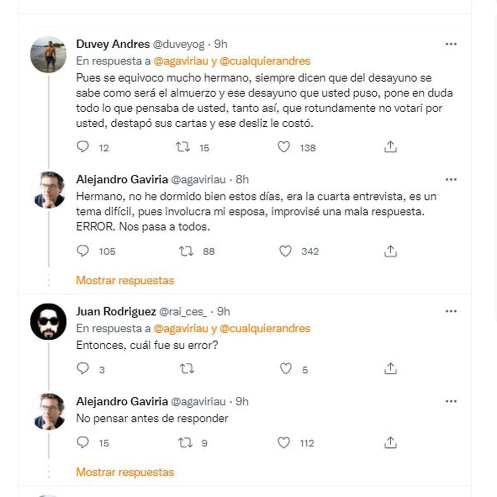 Gaviria, incluso, se dio a la tarea de responderle a varios internautas que también lo criticaron y argumentó que, como había dado tantas entrevistas, no había pensado bien sus respuestas; además, agregó que en los últimos días no pudo dormir bien, lo que, quizá, le causó un ‘lapsus’.