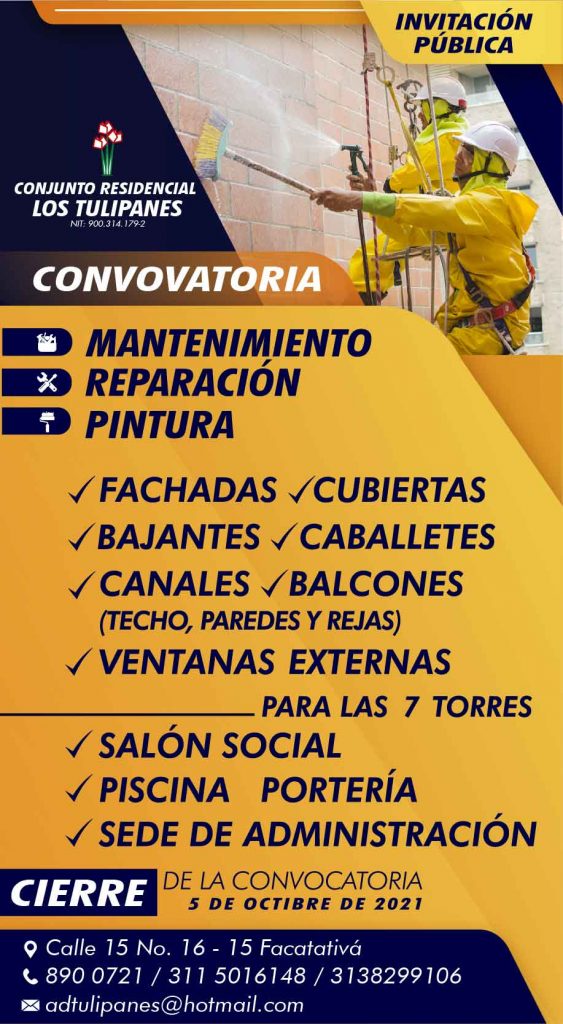 Facatativá, Convocatoria Conjunto Residencial los Tulipanes por mutantes tv · 1 octubre, 2021 Share Post Whatsapp OFERTA DE EMPLEO MUTANTES TV La convocatoria se realizará hasta el próximo 5 de octubre interesados enviar sus hojas de vida o llamar a los siguientes números 8900721- 3115016148- 3138299106. Share Post Whatsapp
