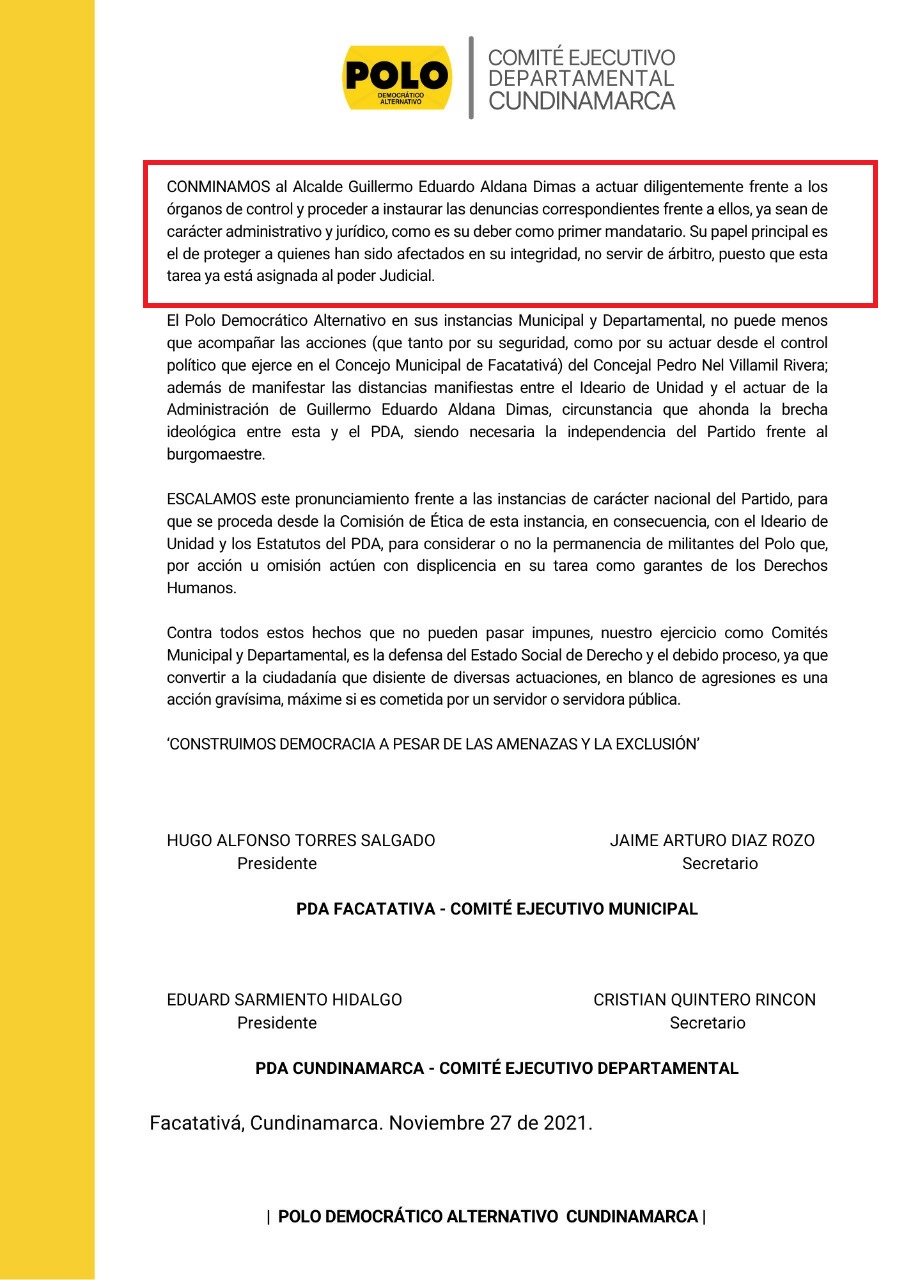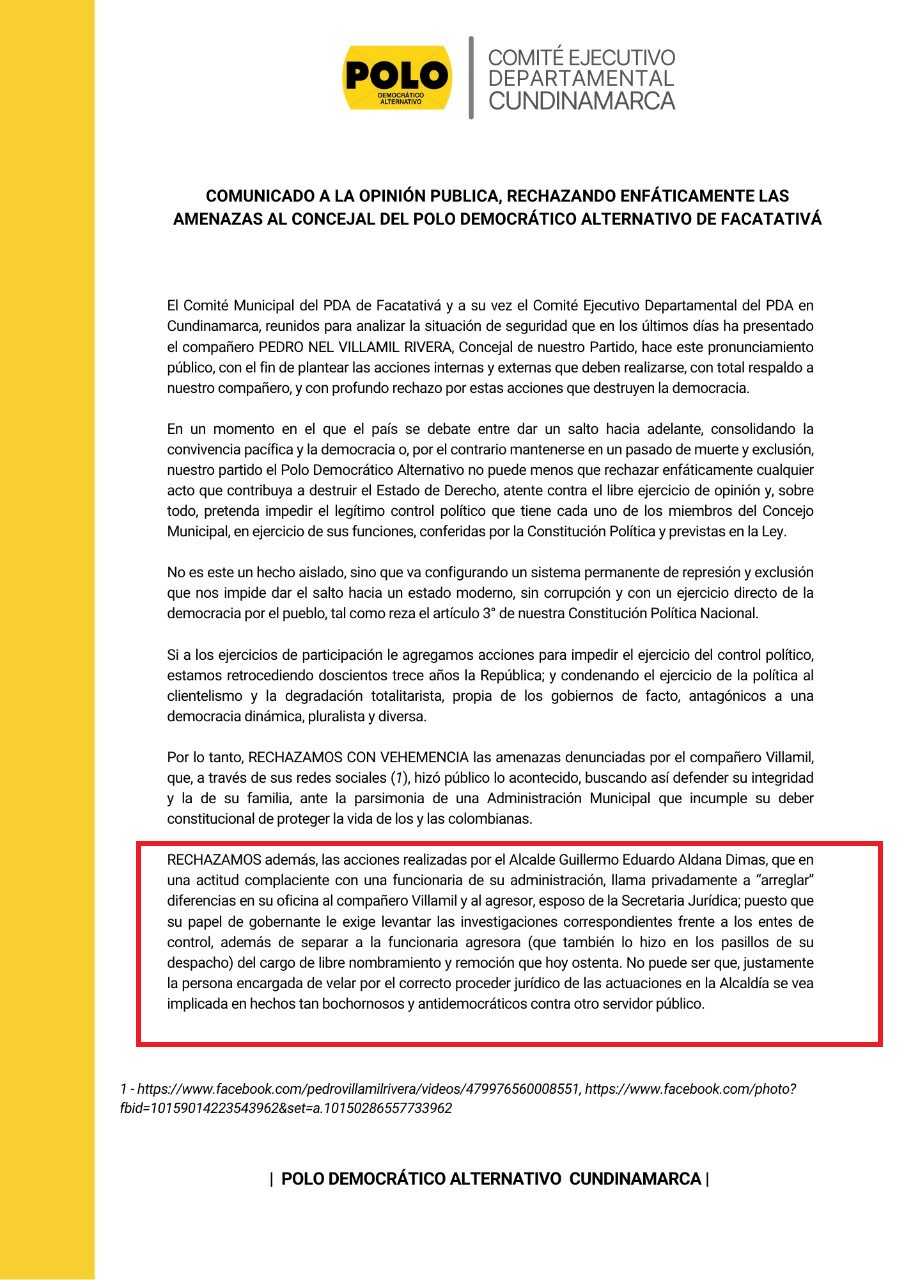 A través de un comunicado publicado en sus redes sociales, el Partido del Alcalde de Facatativá Guillermo Aldana expreso lo siguiente. Como partido debemos mantener la coherencia, se ha hecho cada vez más difícil mantener nuestro apoyo al alcalde de #Facatativá.Esperamos del alcalde Guillermo Aldana muestras de cumplimiento de nuestro ideario de unidad y nuestros estatutos. Manifestamos además nuestra solidaridad con el Comité Municipal y con el concejal Pedro Nel Villamil. Señalan que está siendo muy complaciente con la Secretaria Jurídica de la Alcaldía Paula Emilia Cubillos y su esposo que de alguna manera presuntamente intimidaron al Concejal del Polo Democrático Pedro Villamil.