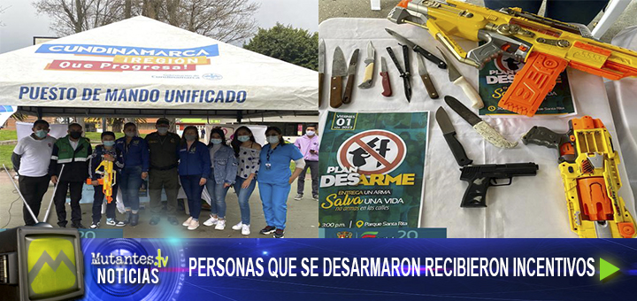 La Secretaría de Gobierno, en articulación con la Policía Nacional y el acompañamiento de la Red Nacional de Iniciativas Ciudadanas por La Paz y contra la Guerra, el Comité de Libertad Religiosa, los Promotores de Seguridad Ciudadana, el pasado viernes se desarrolló con éxito el Plan Desarme. Durante la jornada se acercaron varios habitantes de nuestro municipio y como resultado se obtuvo la recepción de armas blancas y bélicas que tenían en su poder. Las personas que se desarmaron recibieron varios incentivos tales como ayudas nutricionales, concentrado para mascotas, calzado, refrigerio, conmutación el comparendos 1, 2 y 3 y un recordatorio representativo y alusivo a la jornada.