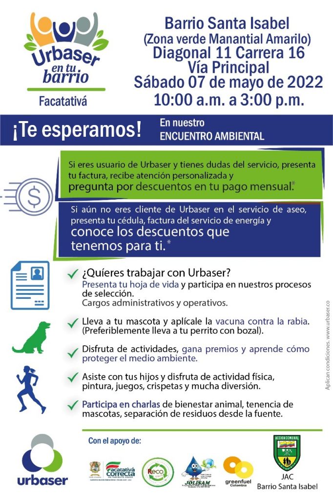 El próximo sábado 7 de mayo en el barrio Santa Isabel (Diagonal 11 Carrera 16, en la zona verde de manantial Amarilo) a partir de las 10:00 a,.m. y hasta las 3:00 p.m. se realizará la segunda jornada del 2022 de “Urbaser en tu Barrio” en Facatativá.