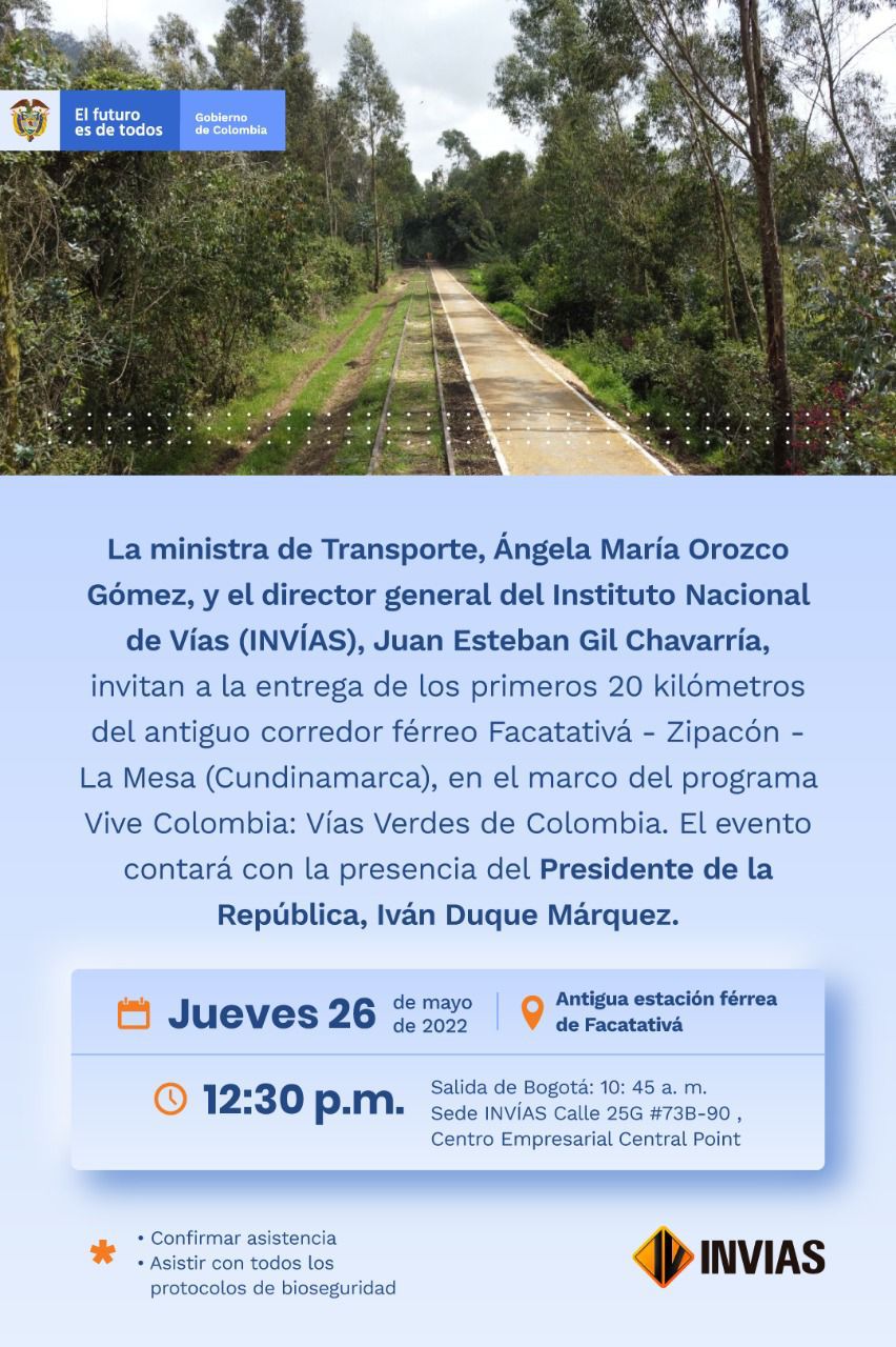 Apreciados periodistas y equipos de medios de comunicación reciban un cordial saludo. Les informamos que mañana jueves 26 de mayo, el Ministerio de Transporte e INVIAS, invitan a la entrega de los primeros 20km del antiguo corredor férreo Facatativá-Zipacón- La Mesa. El evento contará con la participación del Presidente de la República.