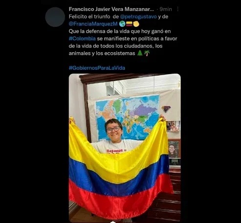 “Felicito el triunfo de Gustavo Petro y de Francia Márquez. Que la defensa de la vida que hoy ganó en Colombia se manifieste en políticas a favor de la vida de todos los ciudadanos, los animales y los ecosistemas”, escribió en su Twitter, acompañado de una foto con la bandera de Colombia”.