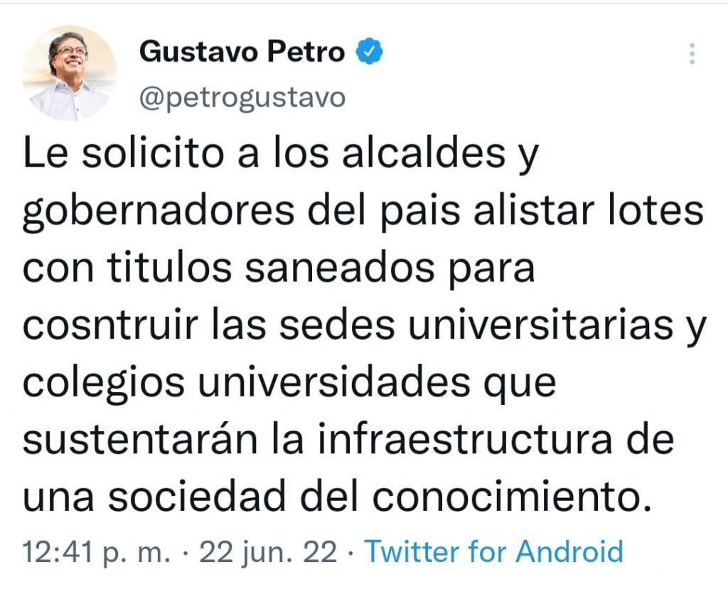 A través de sus redes sociales oficiales los alcaldes de Madrid Andrés Tovar , Funza Daniel Bernal y Facatativá Guillermo Aldana le expresaron al electo Presidente Gustavo Petro, que ya tienen los lotes con títulos saneados para construir Universidades y Colegios Públicos. Con estos anuncios los alcaldes de Sabana Occidente están conectados con la línea del programa de Gobierno de Gustavo Petro en materia educativa, que es una de los pilares fuertes de las propuestas del líder del Pacto Histórico.