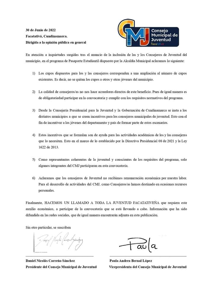 A través de sus redes sociales algunos líderes alternativos señalan que el alcalde utiliza prácticas clientelistas, para beneficiar a los 17 Consejeros de Juventud. Se benefician solo los consejeros?. ¿Y los demás jóvenes de Facatativá que se movilizan a otros lugares para estudiar donde los deja señor alcalde?.Me pueden confirmar si es verdad que los Consejeros de Juventud «negociaron» «gestionaron” ampliar el beneficio de pasaporte estudiantil para ellos mismos. De ser así me parece una bofetada a los cientos de jóvenes facatativeños que requieren este beneficio y tienen condiciones menos favorables. Entre los muchos vicios de la clase política tradicional, uno de los que más rechazo genera en la sociedad civil, es que aprovechan los puestos de «poder» para beneficiarse, beneficiar a amigos y familiares, los intereses particulares por encima de los intereses generales. Expreso Juan David Beltrán Abogado facatativeño a través de sus redes socialesLíderes de movimiento alternativos expresaron lo siguiente. ¿Se benefician solo los consejeros? ¿Y los demás jóvenes del municipio que se movilizan a otros lugares para estudiar? Que mal mensaje se le da a los jóvenes y los habitantes de Facatativá cuando se usan cargos para beneficio propio; desde ya teniendo vicios politiqueros.El video fue publicado por la administración municipal hoy 30 de junio el mismo alcalde de Facatativá Guillermo Aldana lo señala que son a los 17 Consejeros de Juventud, me parece muy mal hecho eso por parte del alcalde, ese beneficio debe ser para todos los jóvenes de Facatativá, invitamos a nuestros líderes alternativos a que pasen un derecho de petición al alcalde municipal, esa es una práctica clientelista porque utilizan un cargo público para obtener beneficios.