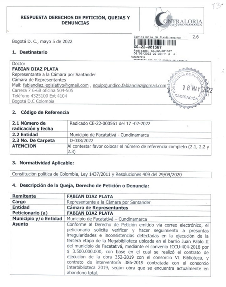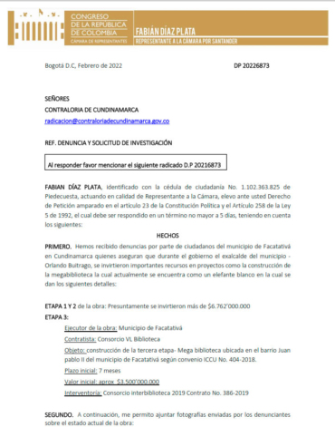 La comunidad de Facatativá, Cundinamarca, acudió al Senador Fabian Diaz para comunicarle acerca del elefante blanco que se convirtió el proyecto de la megabiblioteca del municipio, ubicada en el barrio Juan Pablo II.El Senador Fabian Diaz, denunció las irregularidades ante la Contraloría de Cundinamarca en las obras inconclusas de la megabiblioteca que iniciaron en el 2013 y contó con una inversión de más $6.762’000 millones de pesos para terminar la Etapa 1 y 2 de la obra, durante el gobierno de Orlando Buitrago, exalcalde de Facatativá.La construcción de la megabiblioteca se detuvo en la Etapa 3, a pesar detener una inversión de $3.500 millones de pesos, con un plazo inicial de 7 meses, el contratista responsable es Consorcio VL Biblioteca. Actualmente, la infraestructura se encuentra en pésimas condiciones con grietas, goteras, fisuras e invasión de roedores. El abandono total de la obra generó que personas se apropiaran de las instalaciones para consumir sustancias psicoactivas, aumentando la inseguridad en la zona.El Senador Fabián Díaz logró que la Contraloría iniciara un hallazgo con connotación administrativa, disciplinaria y Fiscal por un valor de $8.297 millones ante la obra inconclusa. La auditoría recomendó establecer un procedimiento de rehabilitación y reparación de los elementos estructurales que tras el abandono de 8 años presentan deterioro.